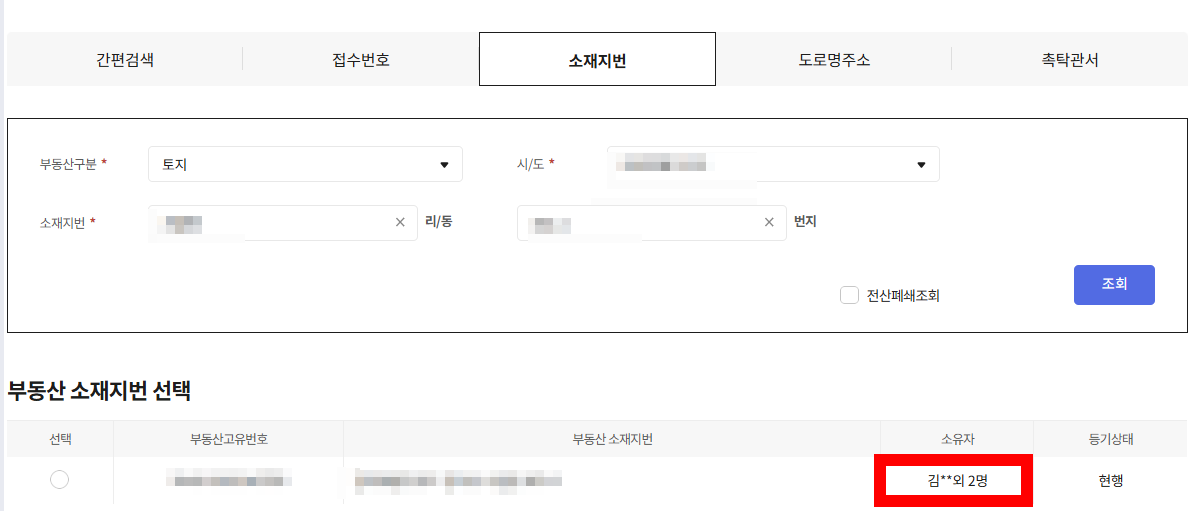 토지의 소재지번, 도로명주소, 고유번호 등으로 검색