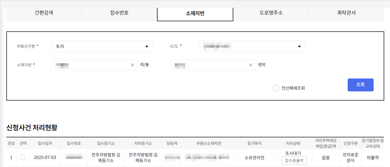 인터넷등기소> 서비스 더 보기 > 등기신청사건 조회 > 소재지입력
