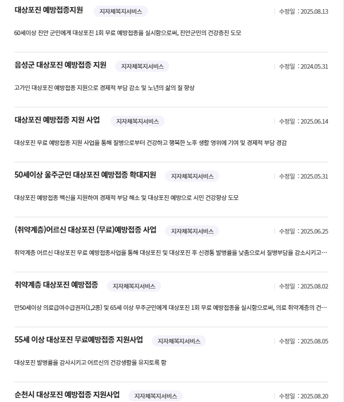 - 고령층 (주로 60세 이상, 일부는 65세 이상): 연령 기준은 지자체별로 달라서 본인 거주지의 지침을 확인해야 합니다.