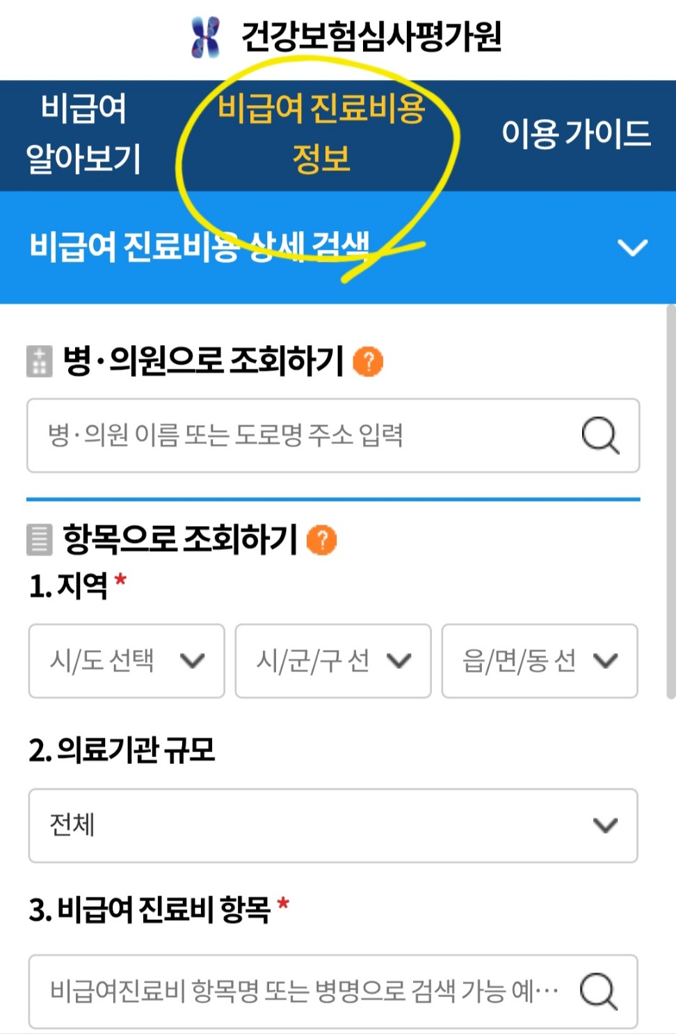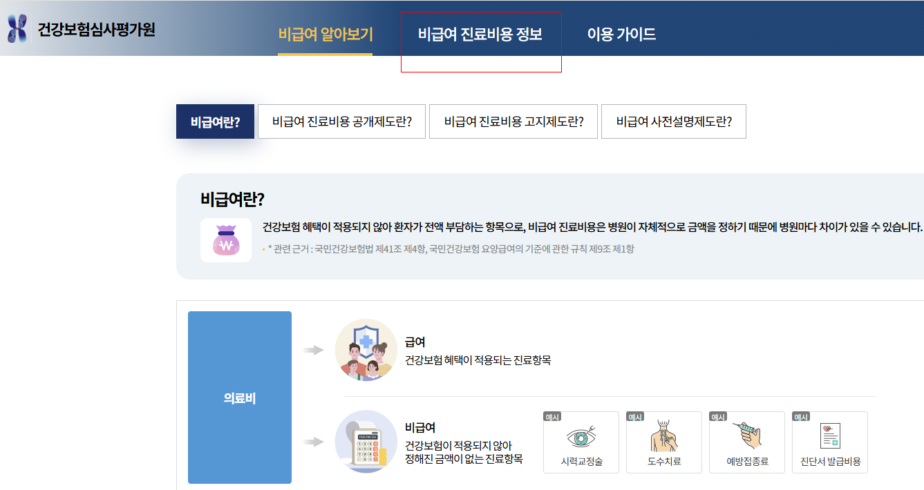 비급여 진료비 정보 > 비급여 진료비용 정보 통해서 확인가능합니다.