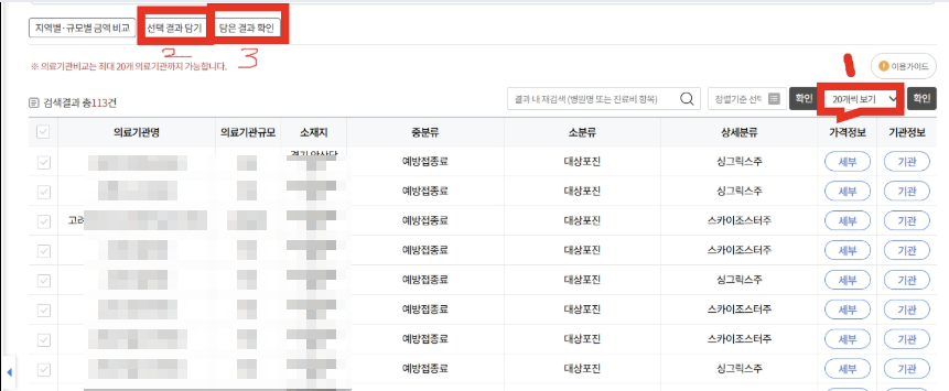 20개씩 선택해서 선택결과 담기 > 담은결과 확인으로 필터링된 정보 확인하여