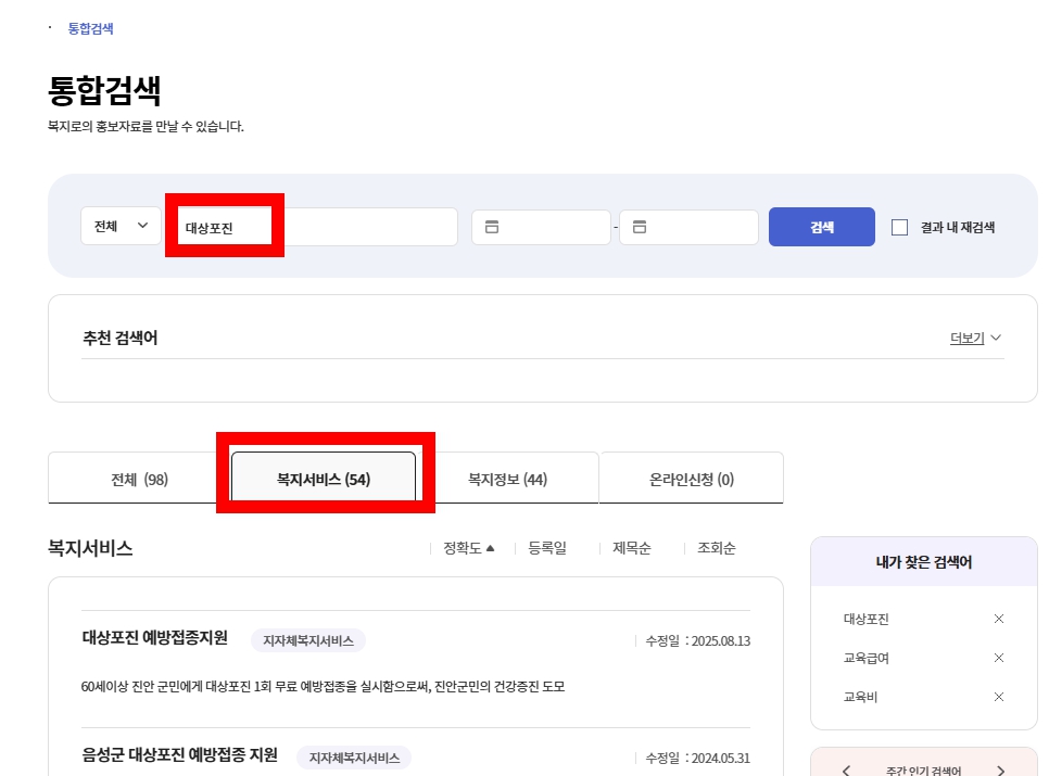 복지로 > 통합검색: 대상포진 검색 > 복지서비스