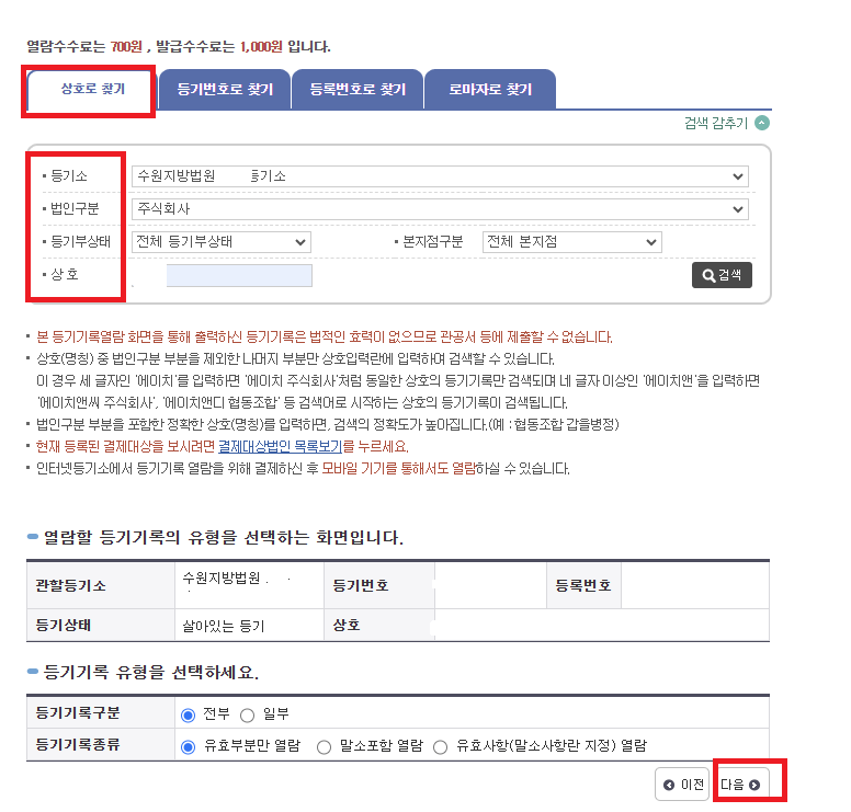 법인 검색: '상호로 찾기'를 선택하고, 해당 법인의 상호를 입력하여 검색합니다.