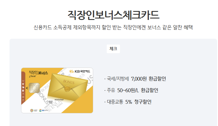 kb국민카드 직장인 보너스체크카드 : 7천원 환급/ (건당 10만원 이상. 전달 30만원 이용실적필요)