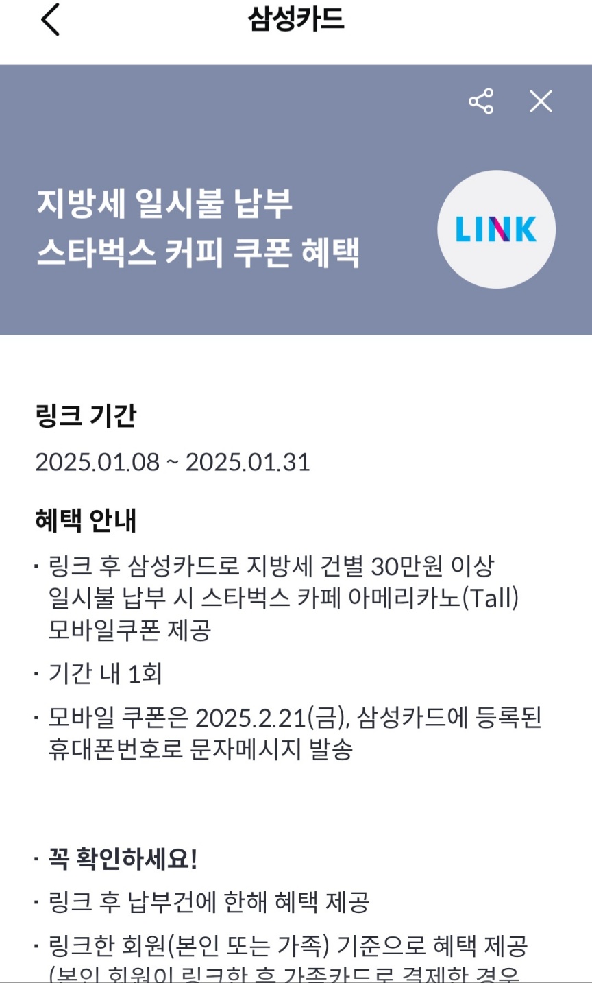 삼성카드 : 혜택 링크 후 30만원 이상 일시불 납부시 '스타벅스 아메리카노'
