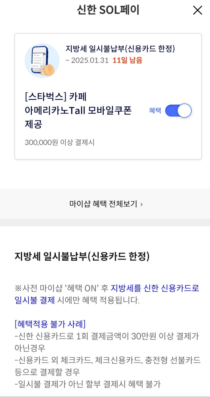 신한카드 : 신용카드로 1회 결제금액이 30만원 이상인경우 '스타벅스 아메리카노 쿠폰'