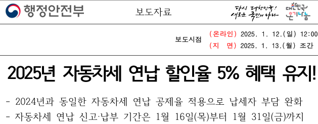 2025년에도 자동차세 연세액을 미리 한꺼번에 납부할 경우 납부할 세금의 5%가 공제되는 절세 혜택이 제공됩니다.