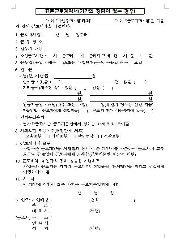 고용노동부에서 제공하는 표준근로계약서를 활용하면 보다 쉽게 근로계약서를 작성할 수 있습니다.