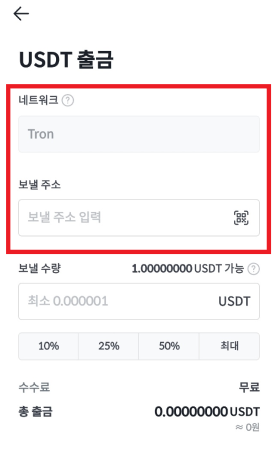 3.보낼주소란에 바이비트에서 복사했던 주소를 입력합니다.(네트워크는 자동으로 tron으로 선택되어 있습니다)