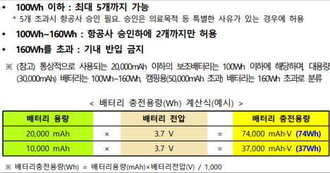 - 100Wh~160Wh: 항공사 승인하에 2개까지 반입 가능