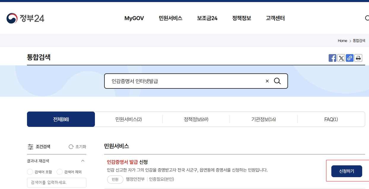 - 민원 검색: 검색창에 '인감증명서 발급'을 입력하여 해당 서비스를 찾습니다.