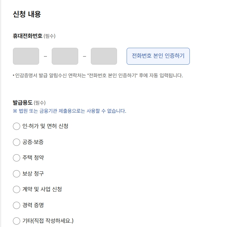 본인인증> 발급용도 선택 > 문서출력