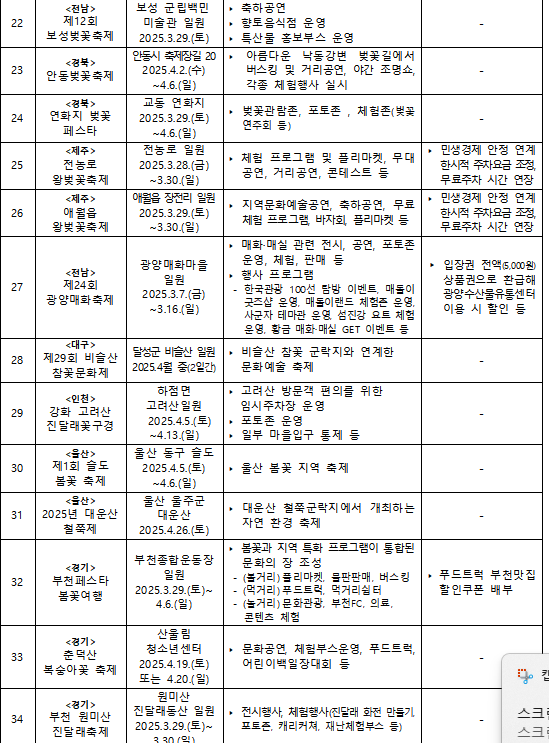 꽃축제/ 전통 문화예술 축제/ 봄철 걷기 마라톤 행사등 .. 축제가 엄청많네요