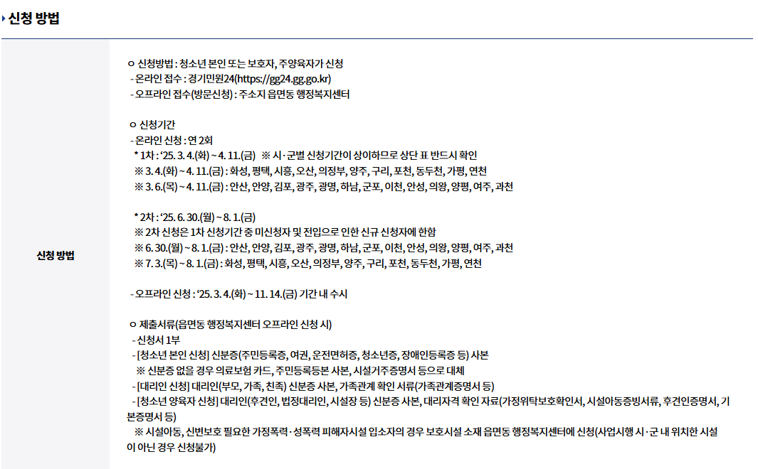 - 오프라인 신청(방문 신청): 주소지 읍·면·동 행정복지센터
