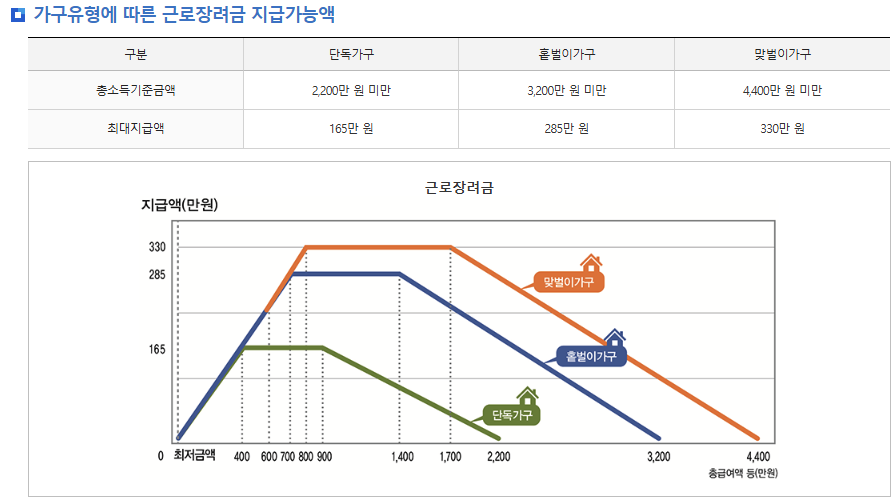 (근로장려금)2024년 부부합산 연간 총소득이 단독가구 기준 2.200만원 홑벌이가구 3.200만원 맞벌이 가구 4.400만원 미만