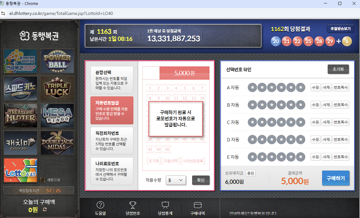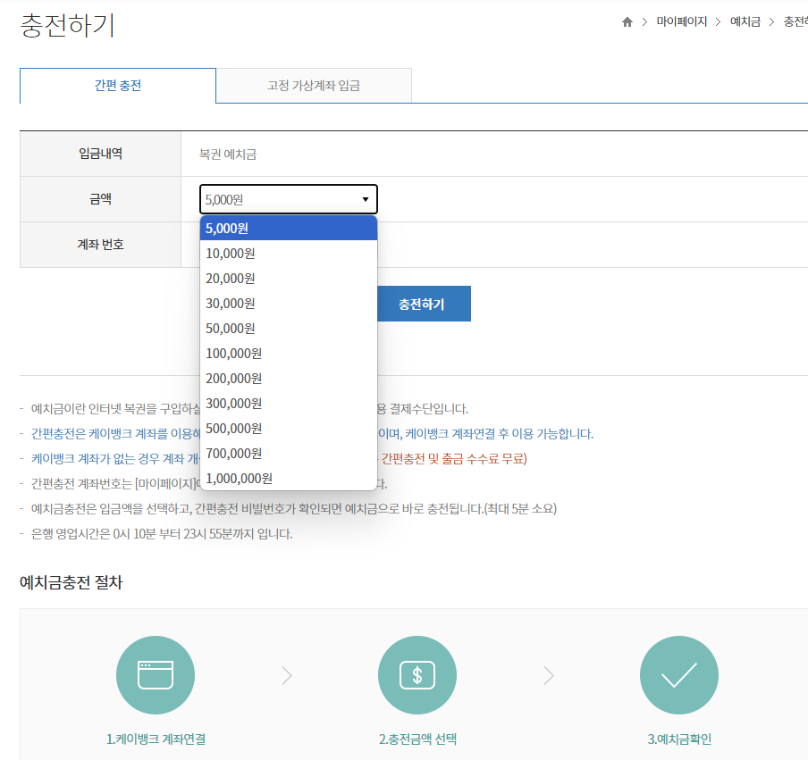 - 예치금 충전: 로또 구매를 위해서는 예치금이 필요합니다. 예치금은 5,000원부터 최대 1,000,000원까지 충전할 수 있습니다.
