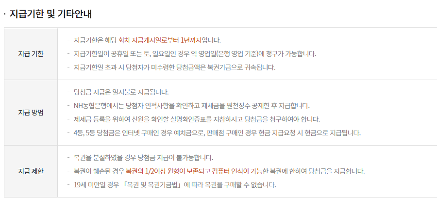 - 1등 당첨 시 : 당첨복권,신분증 지참하여 NH농협은행 본점에서 수령