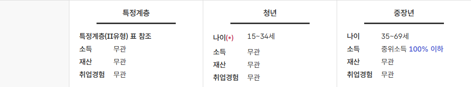 • 1유형: 만 15세~69세 구직자 중 가구 단위 중위소득 60% 이하, 재산 4억 원(청년은 5억 원) 이하