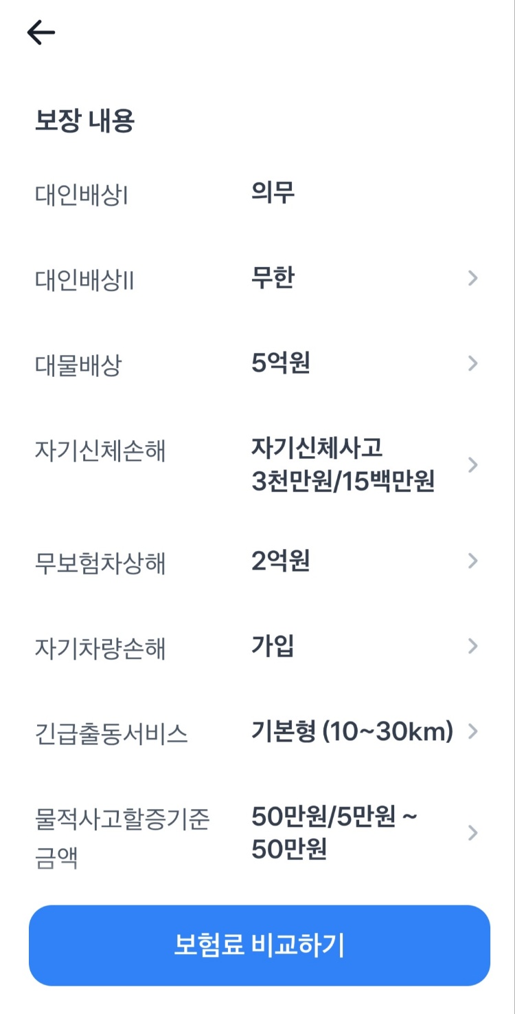 차량정보및 운전자. 보장내용을 선택합니다.