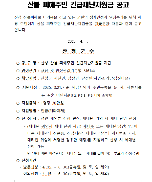 - 지원 명칭: 산청 산불 피해주민 긴급재난지원금 지급