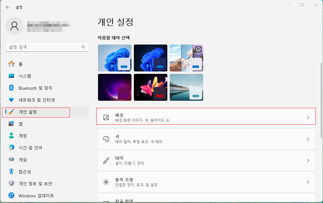 바탕화면 빈 곳에서 마우스 오른쪽 버튼 클릭 → ‘개인 설정’ 선택