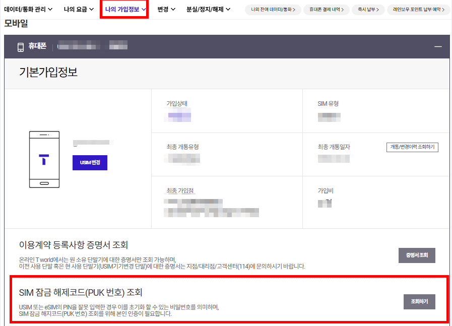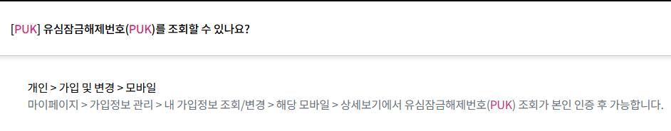 SKT: T월드 → 로그인 → ‘my '→ ‘나의 가입 정보’ → ‘PUK 번호 조회옆 [조회하기] 버튼 클릭