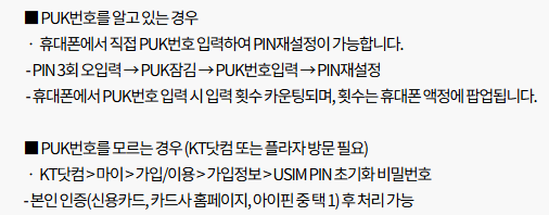 KT: KT닷컴 →마이 → 가입/이용 → 가입정보 → USIMPIN초기화 비밀번호
