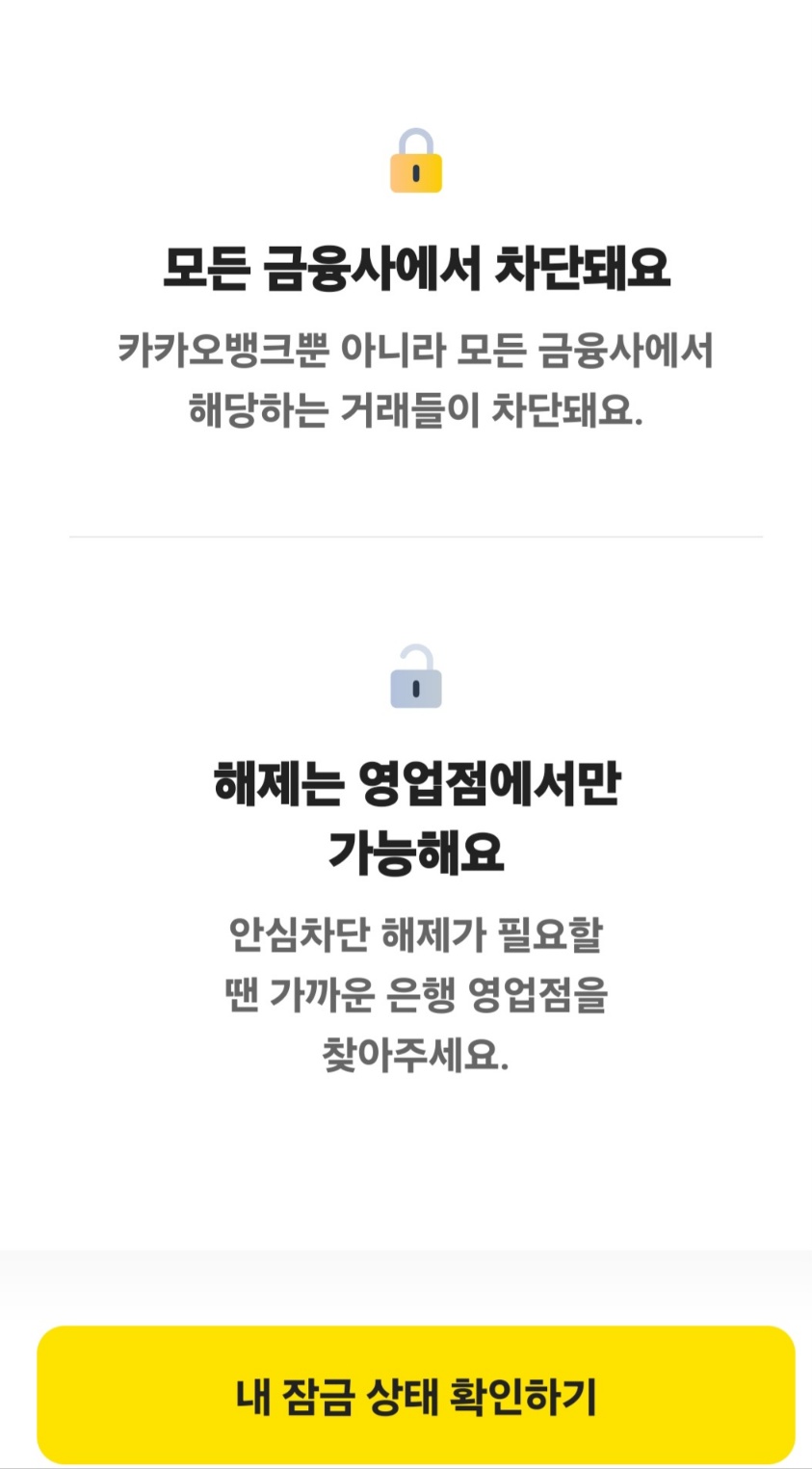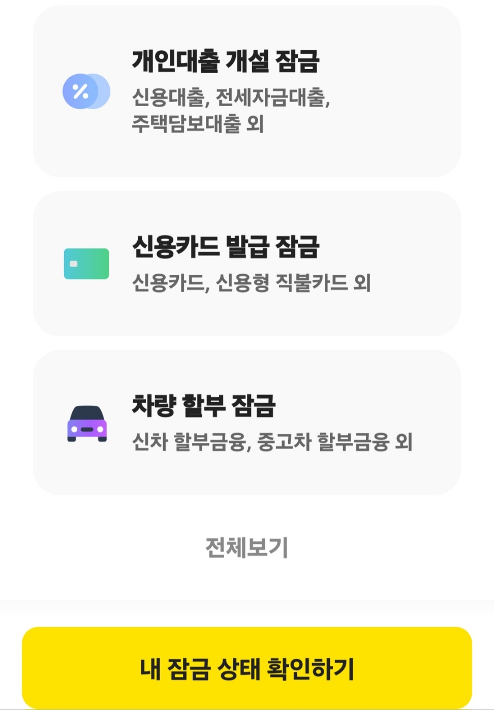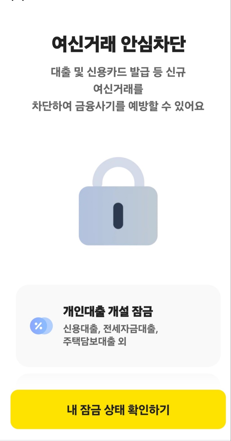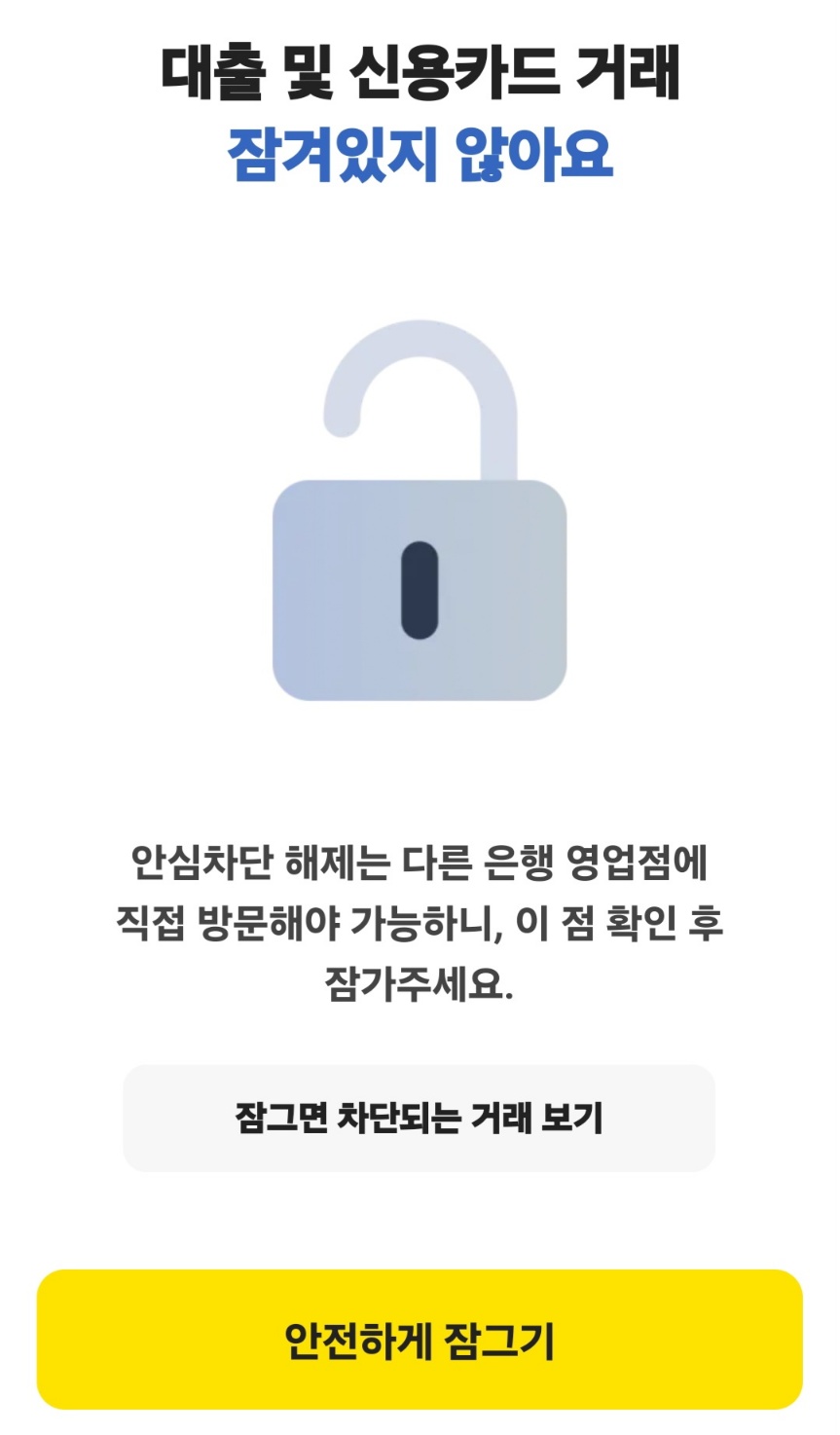 신청 절차: 카카오뱅크 로그인 → 하단 전체 클릭 → 검색창에 여신거래 안심차단 입력→내 잠금상태 확인 →안전하게 잠그기