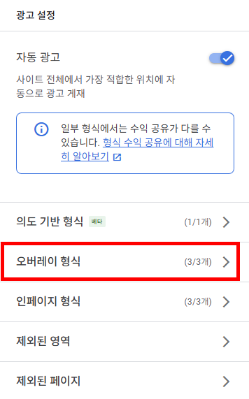 - ‘광고설정 ’에서 ‘오버레이 형식’ 클릭
