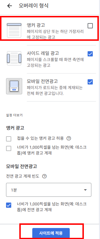 - 오버레이 형식 >‘앵커 광고’ OFF