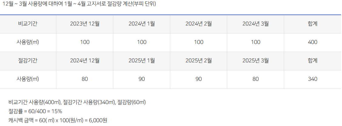 주택난방용 도시가스 요금제 사용자를 대상으로 동절기 도시가스 사용량 감축을 위해 운영하는 제도로 동절기(12~3월) 동안 전년도 사용량보다 3%* 이상 절약하면 절감량에 따라 현금으로 돌려주는 제도입니다. (30%한도, 10원단위 절사)