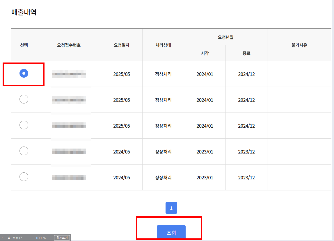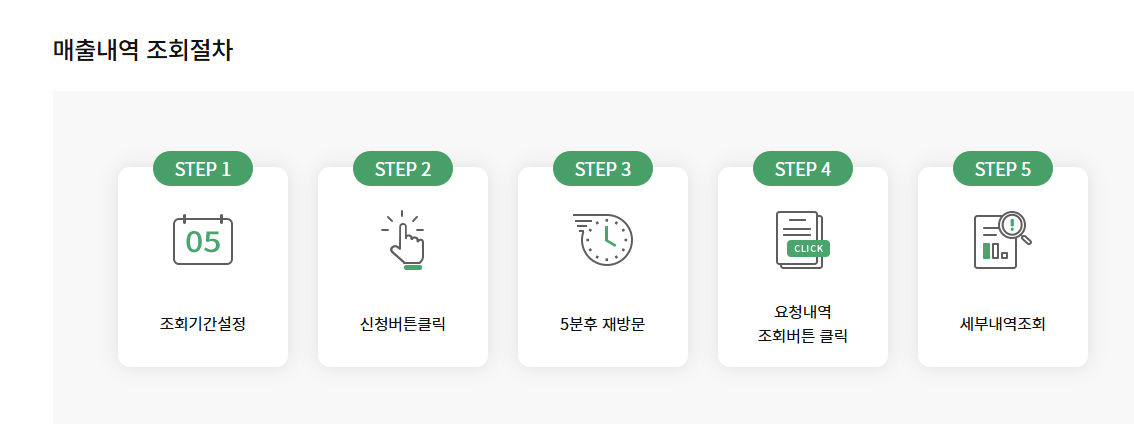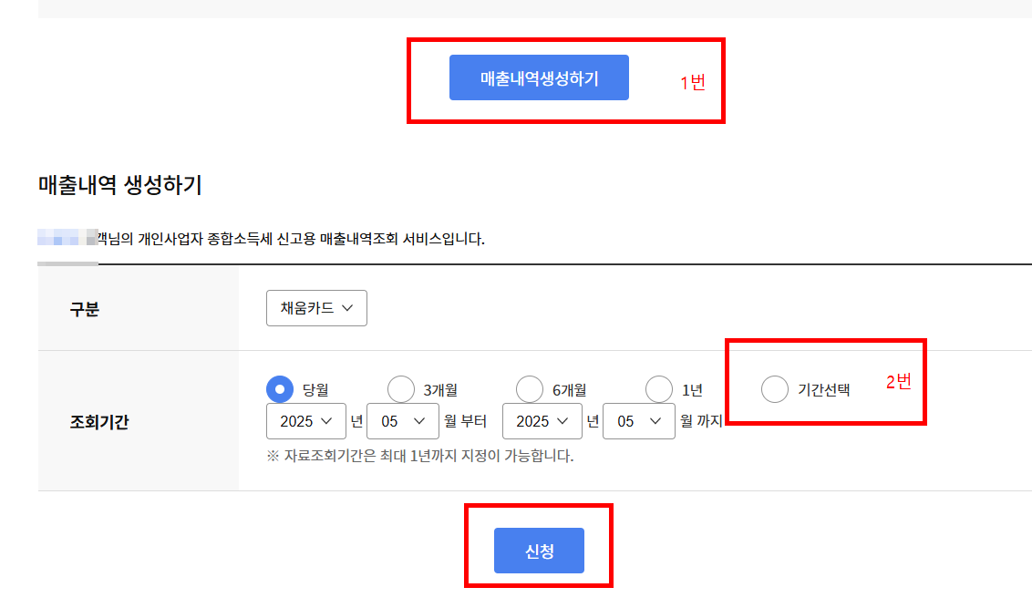 3 매출내역 생성하기 클릭 > 기간선택 > 신청 클릭