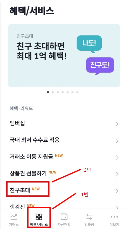 빗썸 앱 하단  [혜택/서비스] > [친구 초대] > 초대코드 만들기